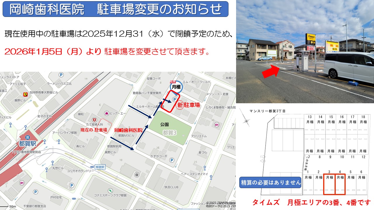 岡崎歯科医院 都賀駅東口徒歩2分 駐車場完備 TEL:043-231-8194 〒264-0025千葉市若葉区都賀3-9-1 都賀M3ビル1階B-2